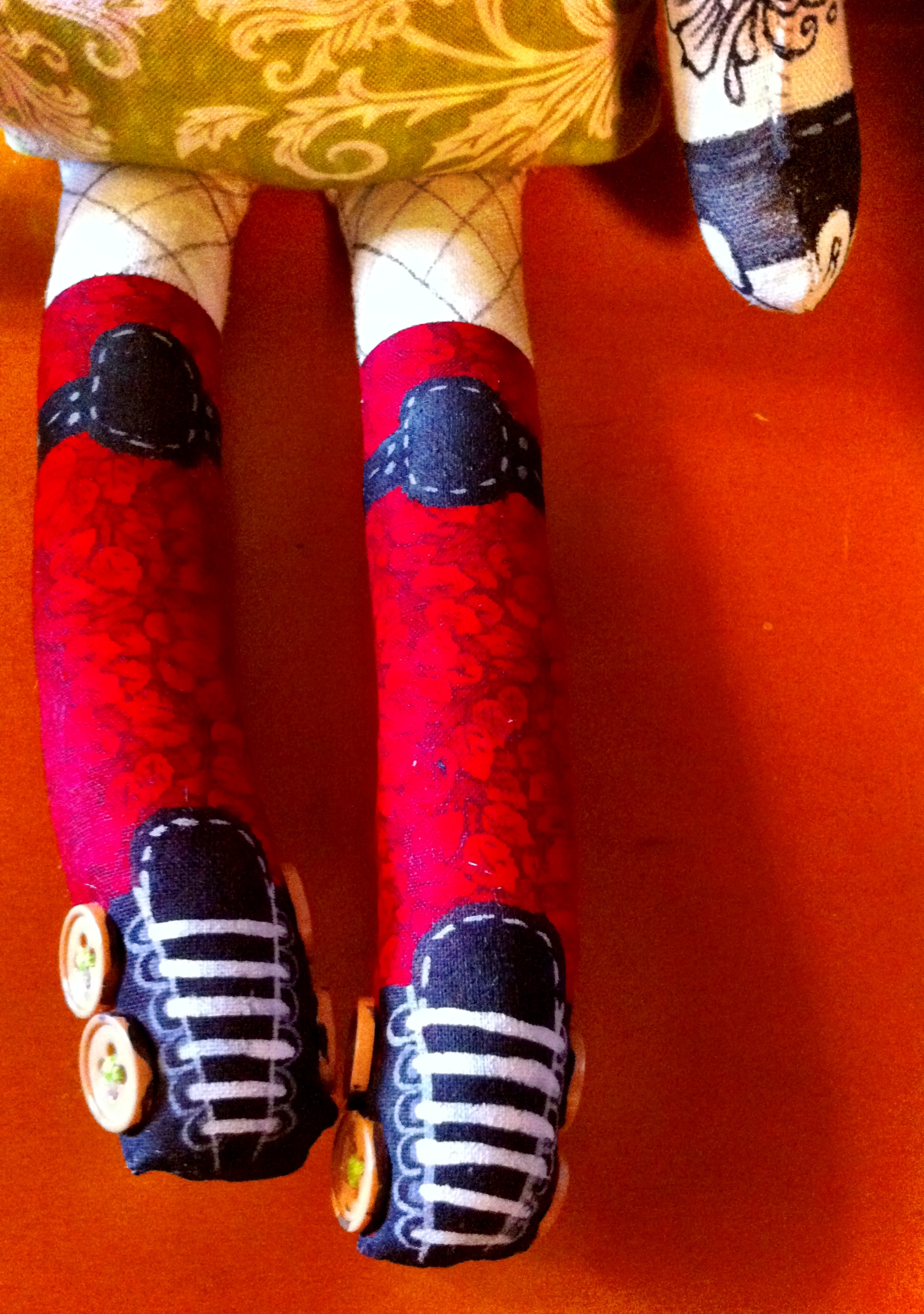 I put her number & name on back, made cute little wheels out of buttons and paint, and painted on the kneepads and wrist guards. The high socks are just a strip of fabric instead of doing one solid piece for the leg, as the pattern said.