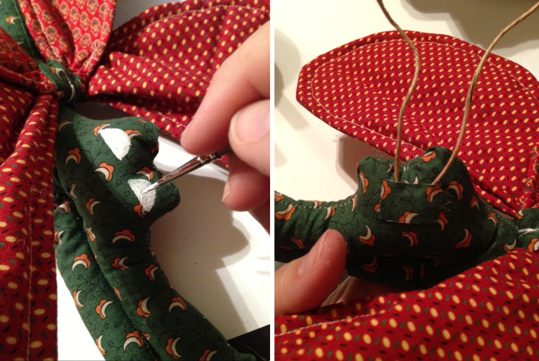 After what seemed like 18 hours of hand-sewing the bottom of the gator’s body (a good tutorial for hidden stitches here, by the way), it was time to paint the eyes. I got out my acrylic paint, and risking my daughter’s critique for putting both eyes on the same side of the head (it’s like that in the illustration!!), I painted them on. I wanted to add some antennae as a final little touch, and found some bendable wire floral rope that I had lying around that I can’t for the life of me remember why I own. Do I have any clue how to attach it to the head? No. In hindsight, I probably could’ve just used embroidery floss to tack it to the back (Yep, I probably should’ve done that). Instead, I cut a couple of tiny snips in the back, threaded the wire through, and glued a fabric panel down with fabric glue. This did actually keep the antennae standing upright, but I suppose a few good stitches could’ve accomplished the same effect without making this fella look even MORE strange.