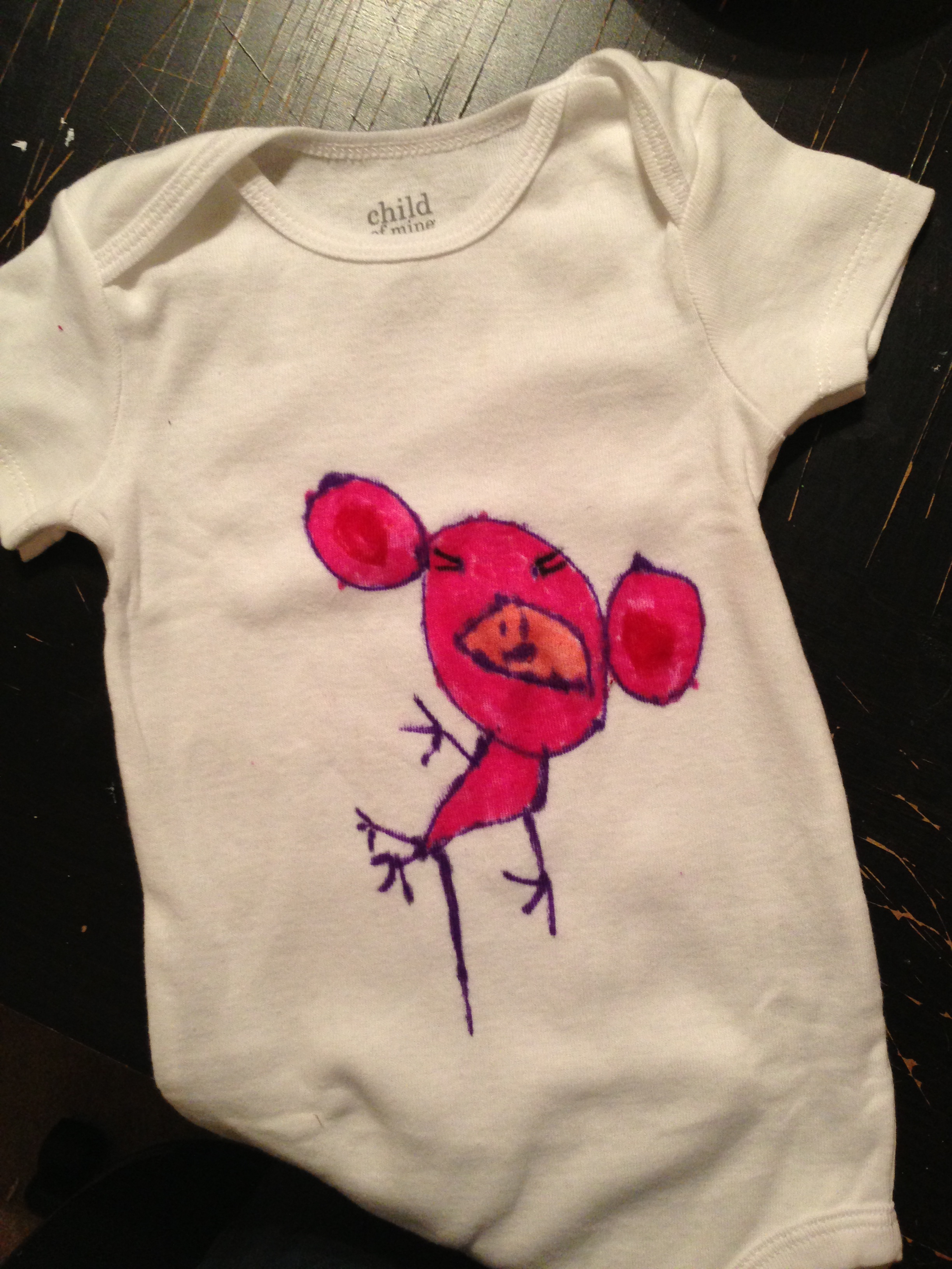 Got a new baby in town that you need a creative gift for? Give your kid free reign with some permanent markers (hey–be careful with those!) on a package of plain onesies and it makes a cute (and wearable) keepsake. (These are ones our daughter did for her new baby cousin.)