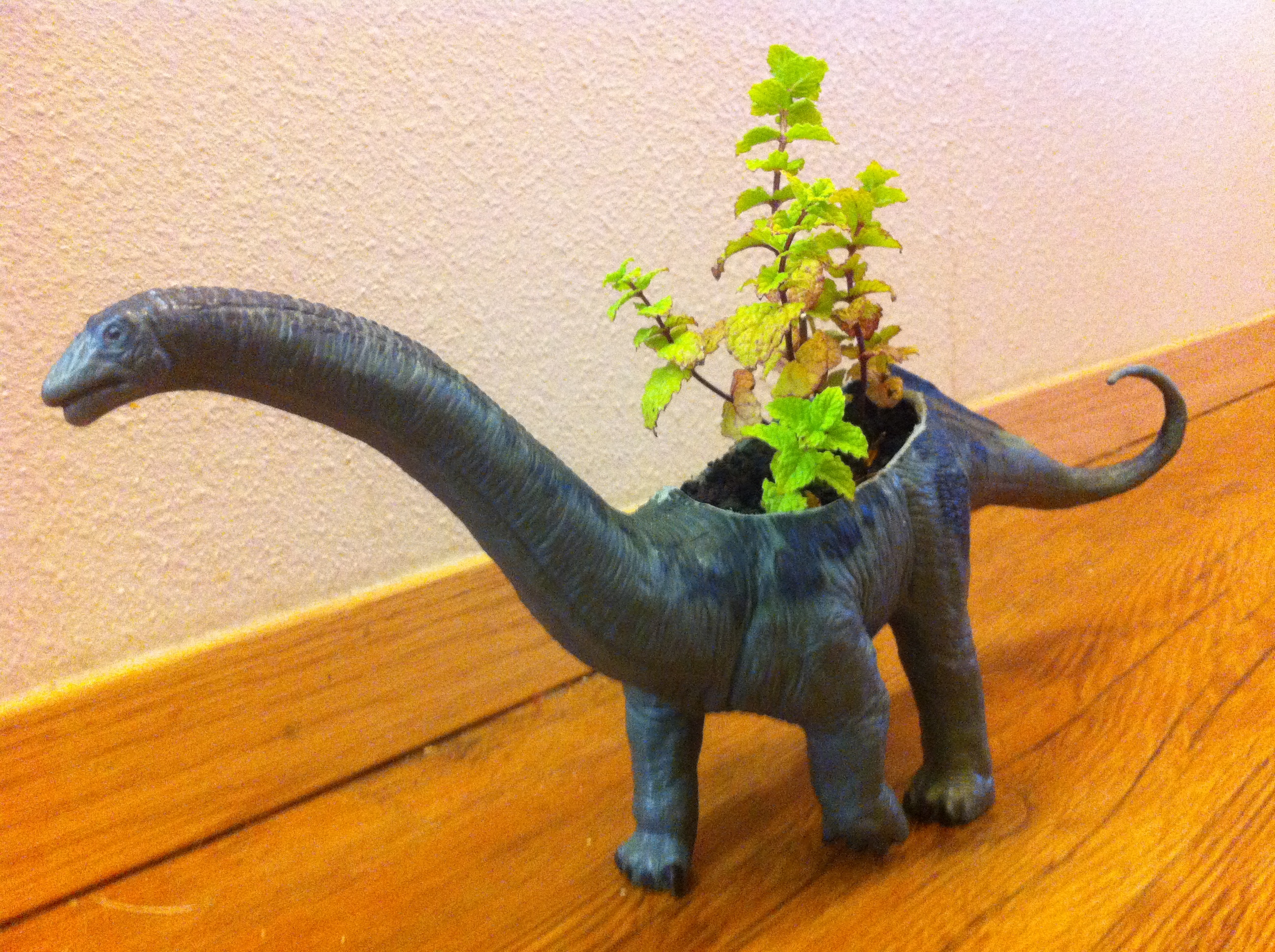 7. Drill a Hole in a Dinosaur. Okay, I found this on Pinterest somewhere. I got an inexpensive little plastic dinosaur toy & used my Dremel tool to cut his back out, filled him with dirt and put a little mint plant inside. Easy peasy!