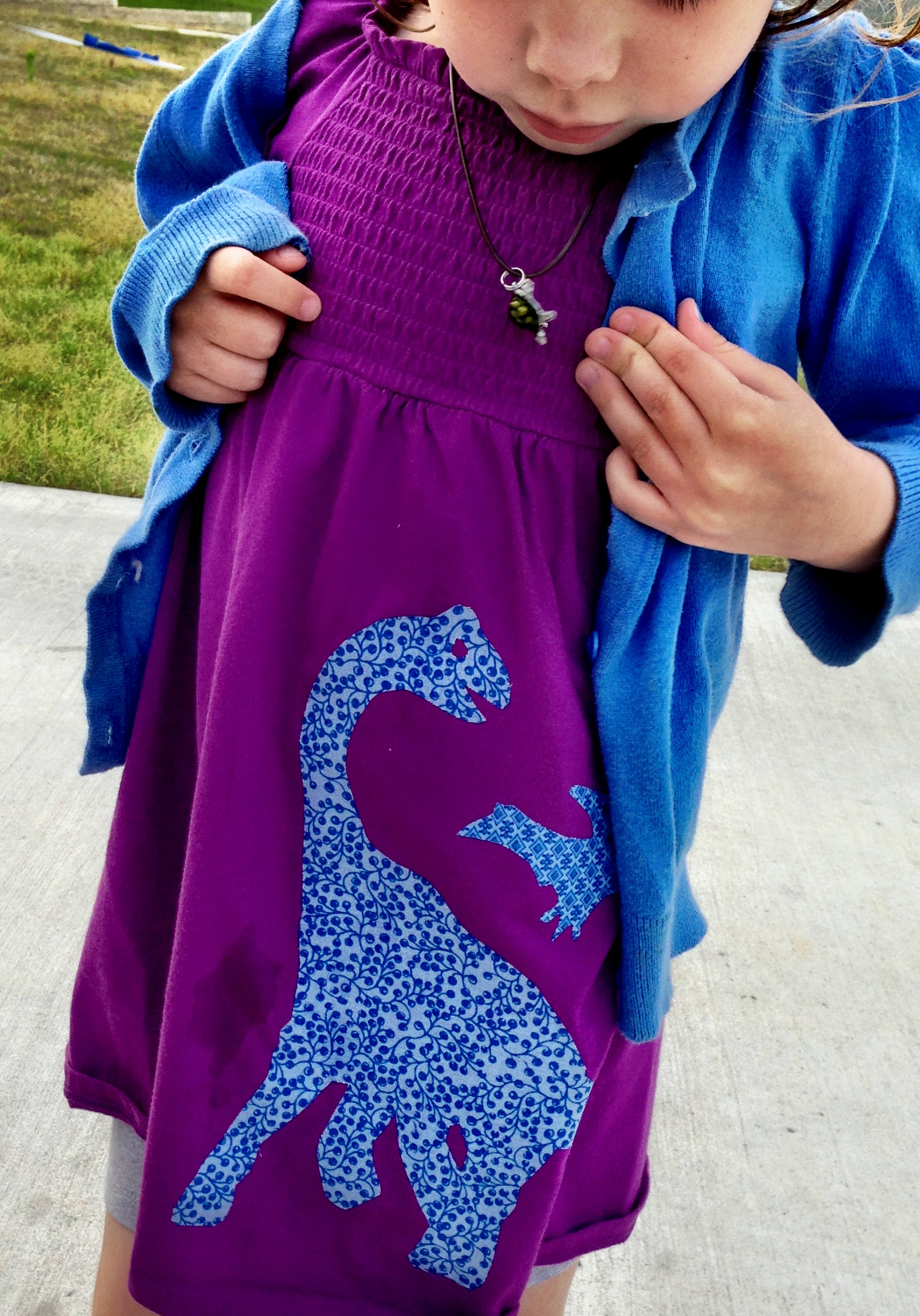 Simply stick the web like a sticker to the back side of the fabric you’d like to fuse to your clothing (in the case above, a brachiosaurus and pteranadon my daughter wanted on her dress shirt). Then draw the design on your fabric and cut it out (it’ll have the fusible web stuck to it). Then iron it on your clothing, and BOOM you have a customized piece of clothing of whatever you like!