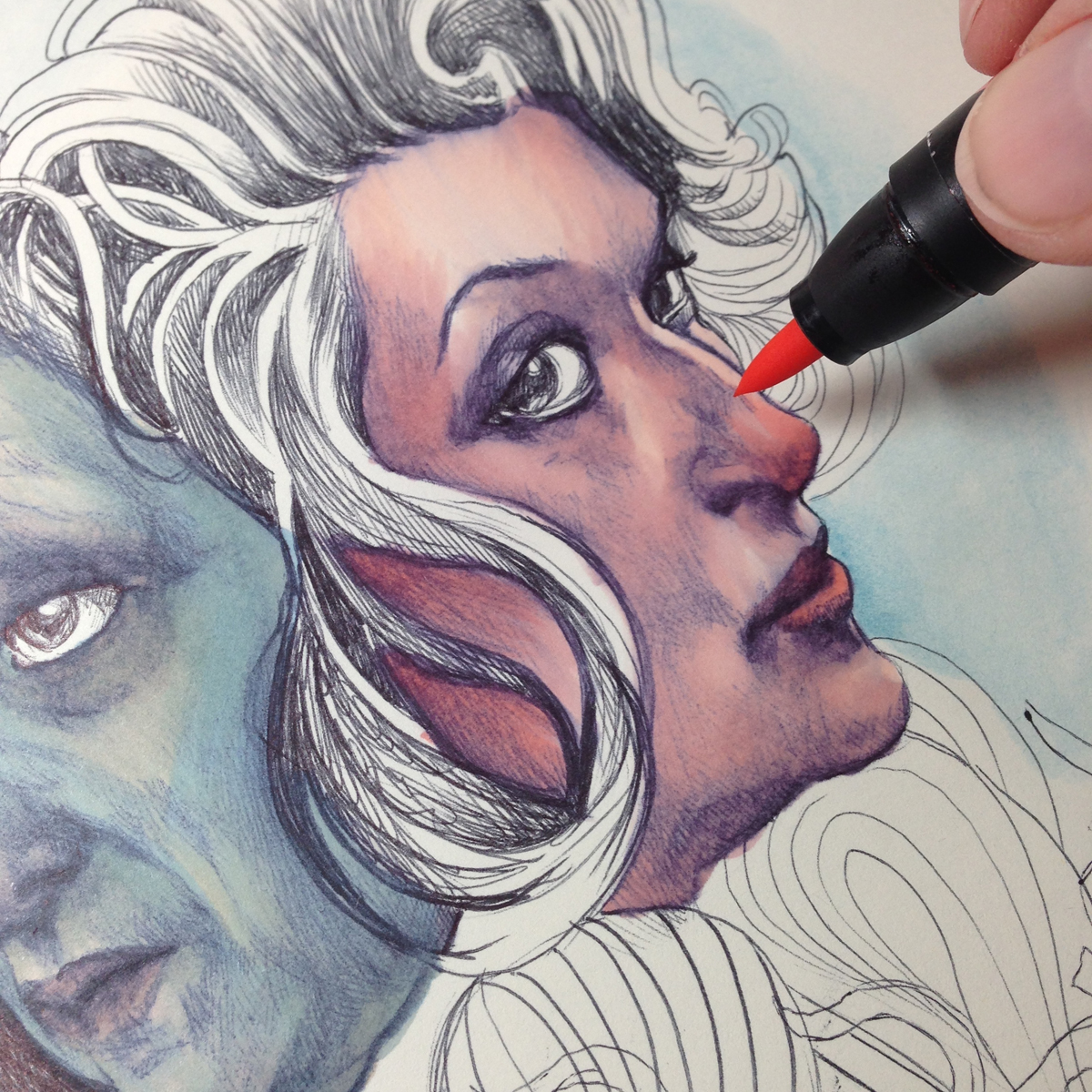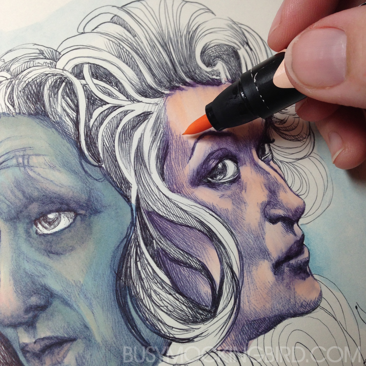 Once the sketch is done, I usually use watercolor or acrylic, but for this one, I challenged myself to use markers (since Aaron uses them a lot). Several people use Copics, but I prefer Prismacolor Premiere Brush Tips for no real reason, other than that I’m comfortable with them, and I love them.