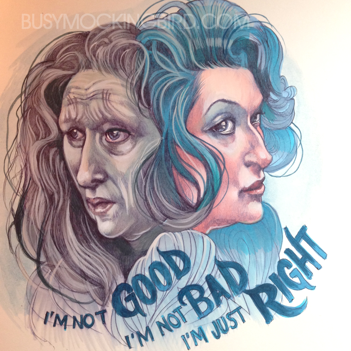 So here’s a typical project: Awhile back, my art friend Aaron McMillan (@mcmillankid on Instagram) and I challenged each other to draw Meryl Streep. I wanted to draw both versions of her witch from “Into The Woods.”
