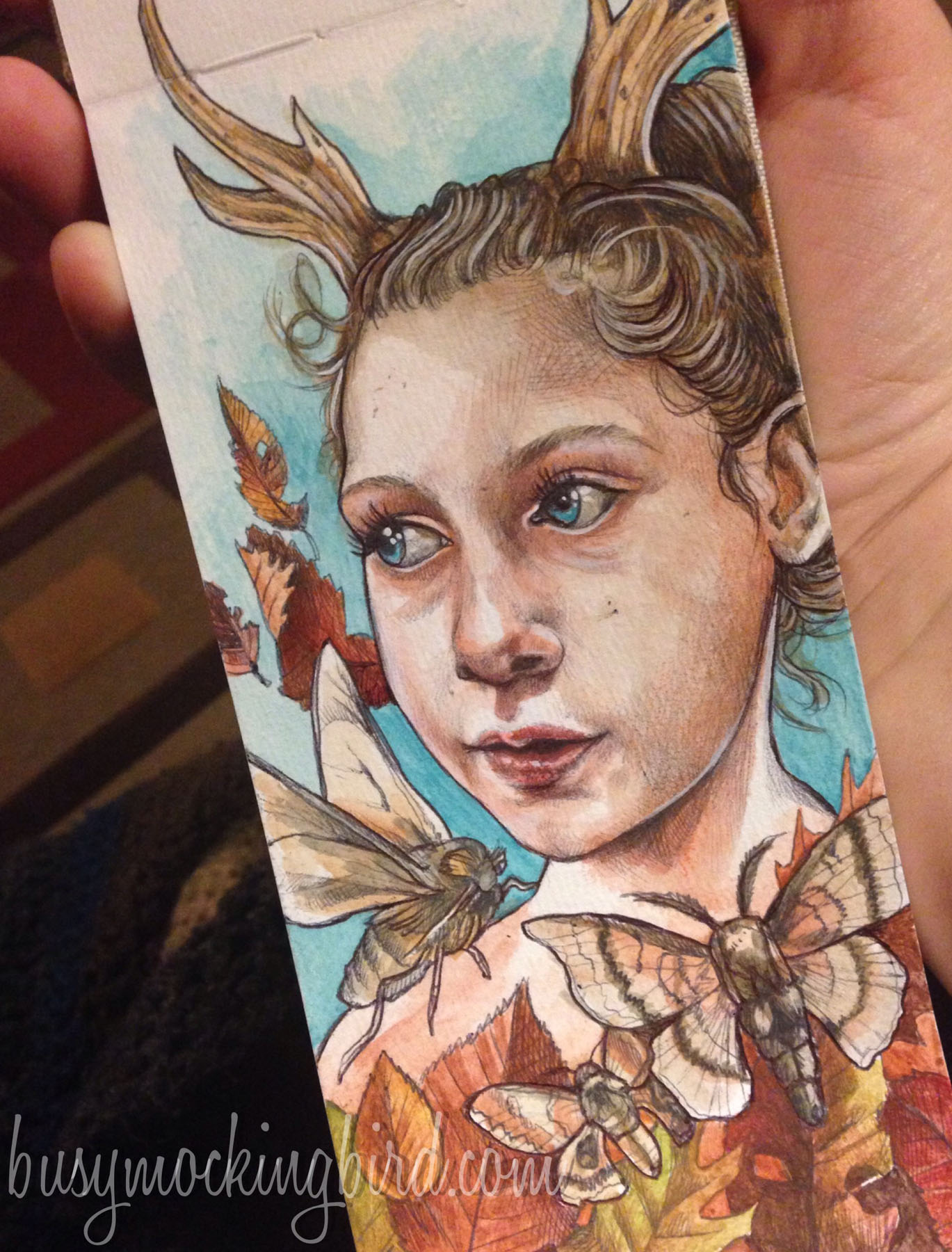 It was longer & thinner, which would make for a more awkward drawing space, which I found to be a fun challenge. That night, while my mom & I watched movies, I doodled Myla and some autumn moths in a pair of antlers.