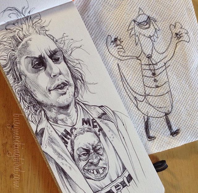 Day 2: Beetlejuice. I drew Michael Keaton as Beetlejuice, wearing a shirt of Beetlejuice (from the Howard Stern Show), and Myla drew Beetlejuice with a snake-tail and bugs in his hands (she’s never seen the movie).