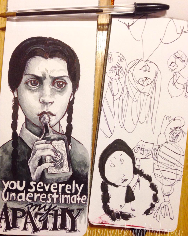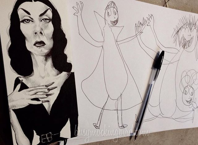 Day 7: Wednesday Addams. Since it was Wednesday, we HAD to draw a Wednesday! Again, she didn’t know who she was, but Myla was digging the idea of a creepy family.