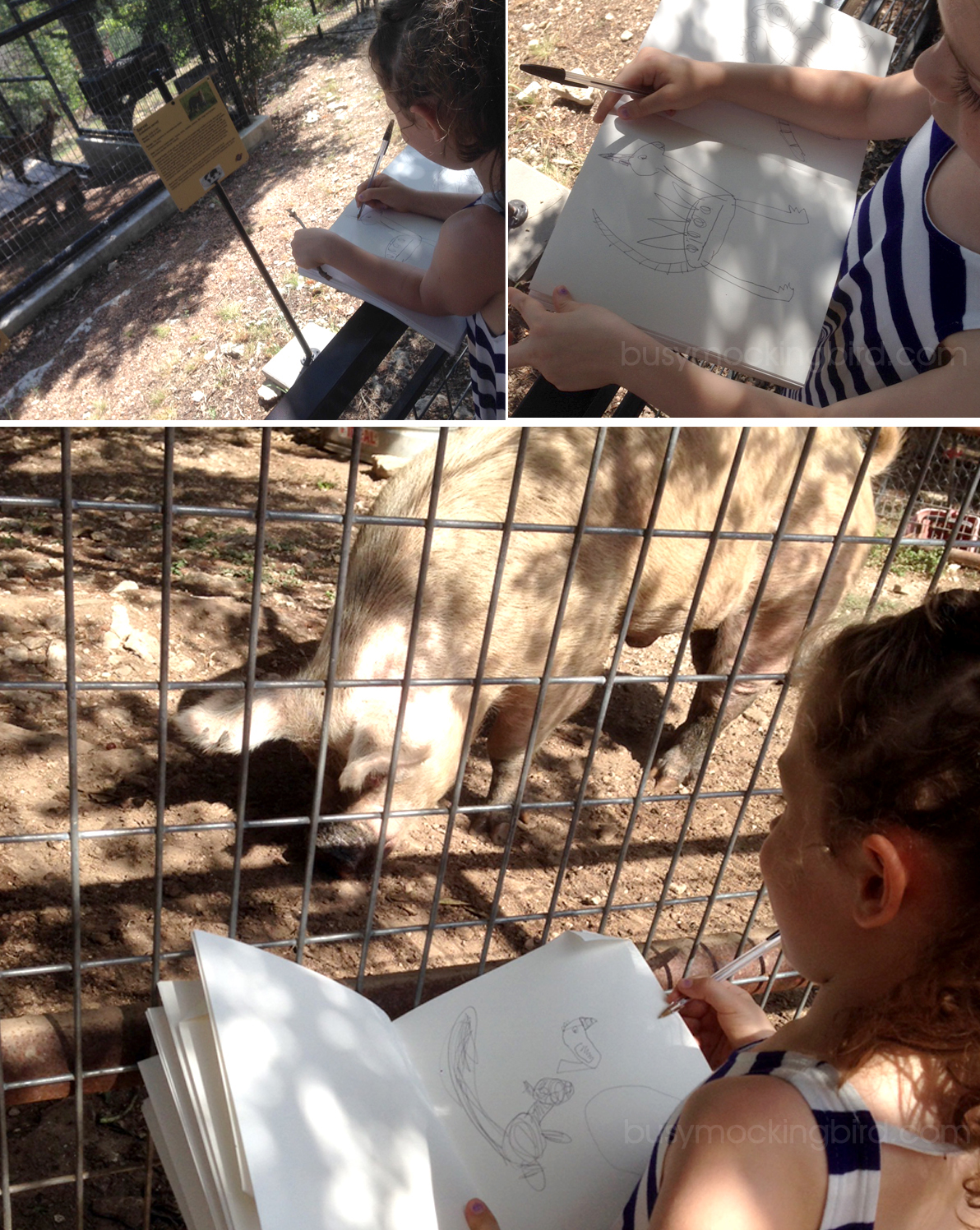 It didn’t really matter WHAT the drawings looked like. In fact, everything I drew ended up as just a little strip of a tiger stripe, or a rough doodle of the turtle’s eye. What I really enjoyed was watching HER excitement, and seeing things through her eyes. “WOW, mom! That pig is so big and cool and guhSKUSTING!”