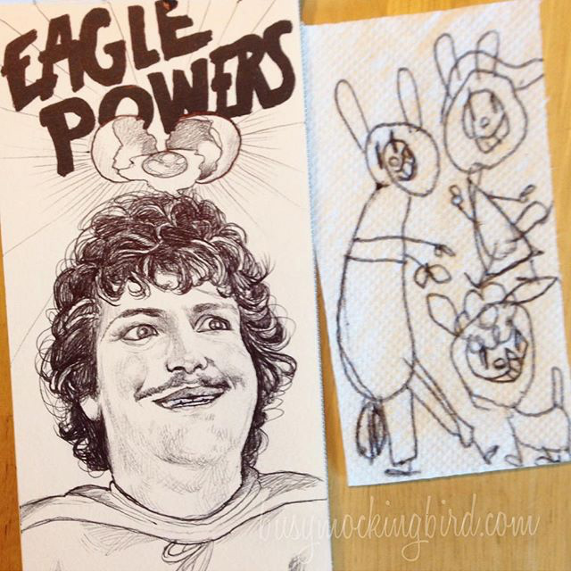 Dang. I was having fun drawing Adie! But I don’t mind, obviously. She asked if I was using my imagination to draw, and I told her I had started by looking at a photo of Adie. She was very interested in that. “Can I finish the drawing, and use the photo to look at, too?”