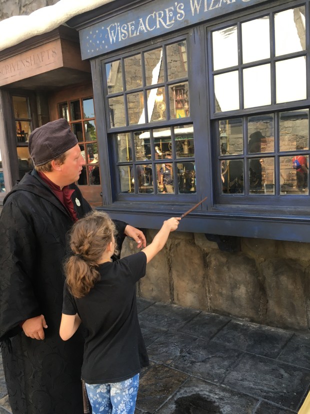 Since Myla’s a kid (and gets her clumsiness from me), she dropped her wand a couple of times (see the chip in the skull’s eye on the left up there?), and when it wouldn’t work anymore at one of the spell sites, a wizard helper advised us to swing by the Owl Post for a FREE wand repair! At no charge, the wizard there took it to the back and got us a brand new one, which (for a clumsy wizard like myself) I thought was AWESOME.